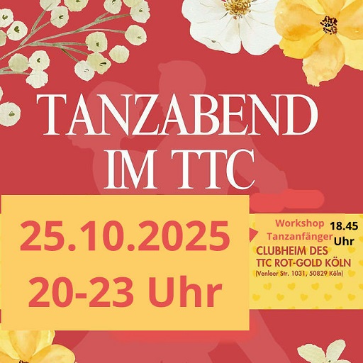 Sa. 25. Oktober 2025 @ 18:45 – 23:00 – Herzlich Wilkommen zum Paartanzen Walzer, Rumba Discofox, etc Tanzabend im TTC Rot-Gold Köln 18.45 Uhr Grundschritte für Anfänger 20-23 Uhr Tanzabend (Eintritt frei), Venloer Str. 1031, 50829 Köln All Level All Age willkommen – einzelnd zu zweit zu dritt… auch ohne Tanzpartner – wir wechseln untereinander https://share.meet5.net/m/6257542005330926